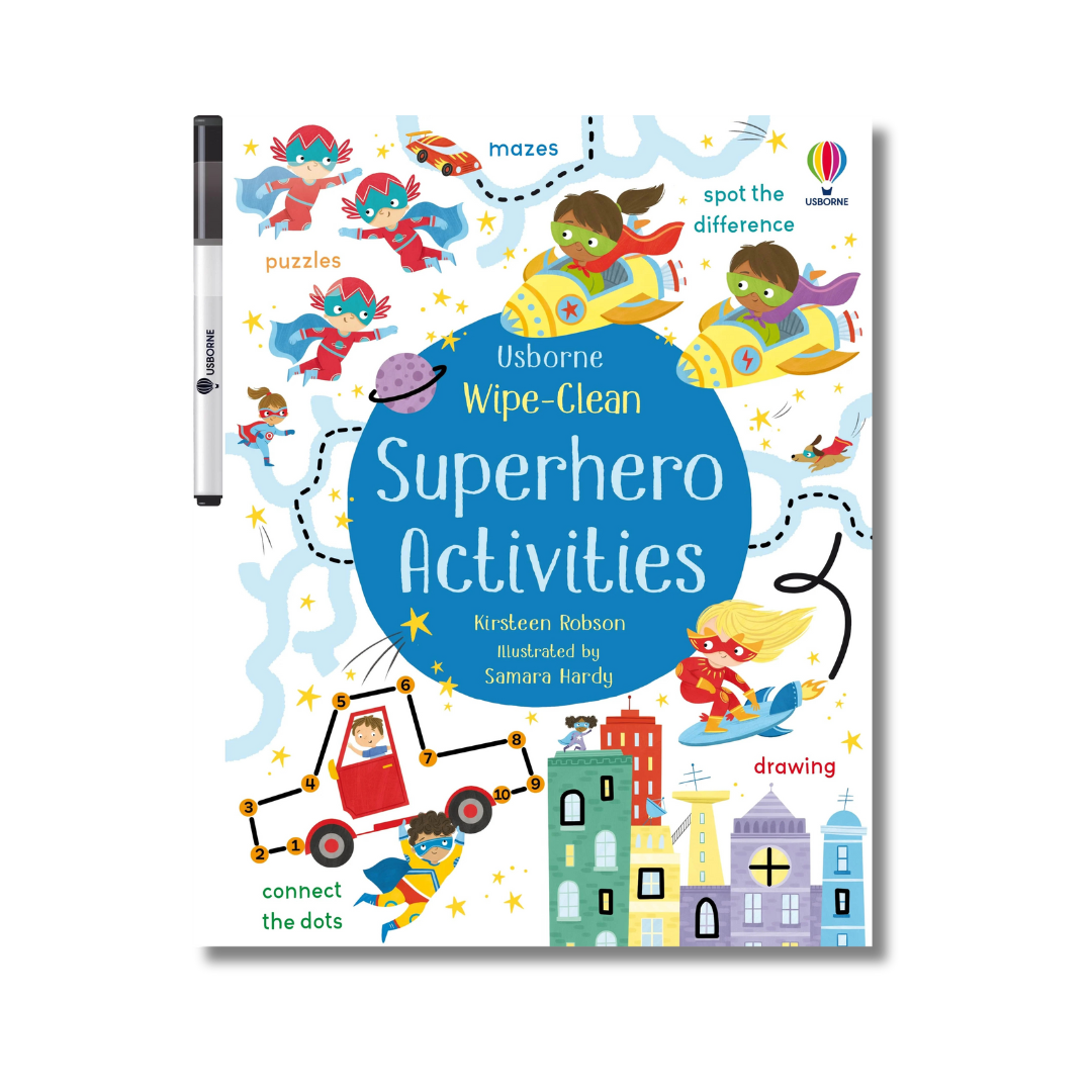 "Wipe-Clean Superhero Activities" îi introduce pe cei mici în lumea eroilor Spring, Skydart și prietenii lor printr-o serie de activități pline de acțiune. Copiii pot uni puncte, găsi diferențe, rezolva labirinturi și trasa linii punctate, exersând în același timp abilități esențiale precum coordonarea și controlul stiloului. Cu pagini lucioase refolosibile și stilou inclus, distracția poate fi reluată la nesfârșit!